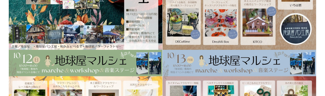 地球屋 シルバーウィークイベント開催します! 2021.09.11 9月18日~20日の3日間! 地球屋恒例のシルバーウィークイベントを開催いたします。 メダカ20匹100円(2000~5000円位) 半だるまメダカ3匹100円(1匹500~800円位) 今回はメダカすくいではありません。お一人様1カップ! 森の中の音楽祭開催! 歌・ダンスと楽しんでください。 マスク着用・ソーシャルディスタンス・消毒は必須です! 今回は緊急事態宣言中ということもあり、新聞折込やDMは一切おこないません。 またこのイベント開催につきましては、県庁の危機管理課に相談・指導を受けまして、指導を受けたことを守り開催いたします。 Tweet Share オモウマイ店!!! モルタル造形教室(基本編) 新着記事 お知らせ一覧 2025.09.08 地球屋パン工房 珈琲の提供方法を新しくしました(9月8日~) 2025.06.06 お詫びとお知らせ(全粒粉食パンについて) 2025.04.14 2025年 GW大バーゲン!!! 2025.03.25 毎月マルシェを開催します 5月は 2025.03.14 今年初めての地球屋マルシェ開催!!!のおしらせ
